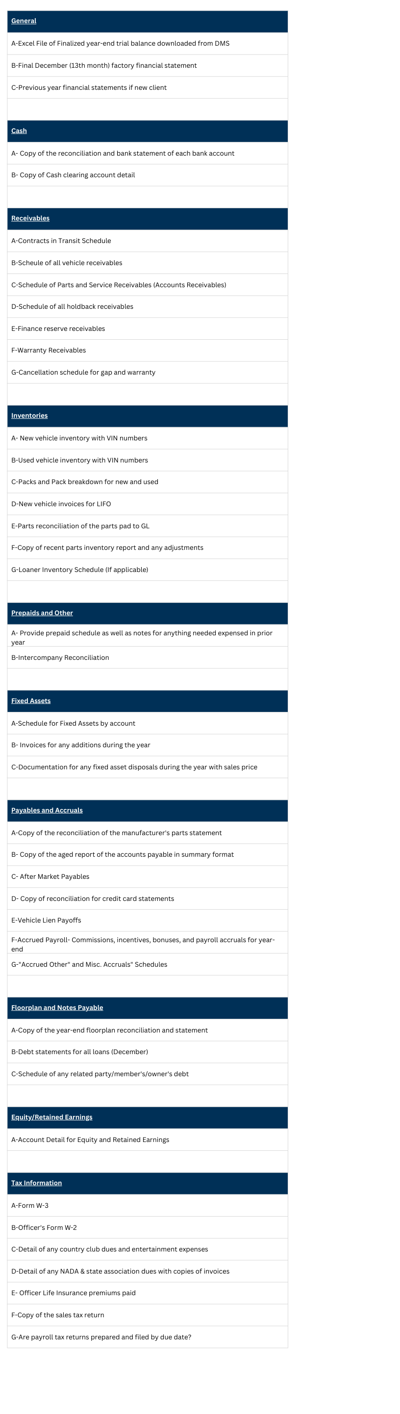 - Floorplan Reconciliation: Are there vehicles that are on your floorplan and not in accounting? Or mis-posted vehicles that are in accounting and show owed to your floorplan? Make notes of any outstanding issues on your final year end reconciliation.